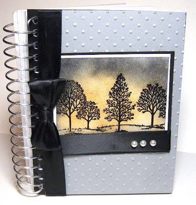 decided to create a different journal for them (I used the same technique to create the background cardstock layer and ribbon).  The focal panel is a modified version of a recent card that I created - see post under Lovely As A Tree.